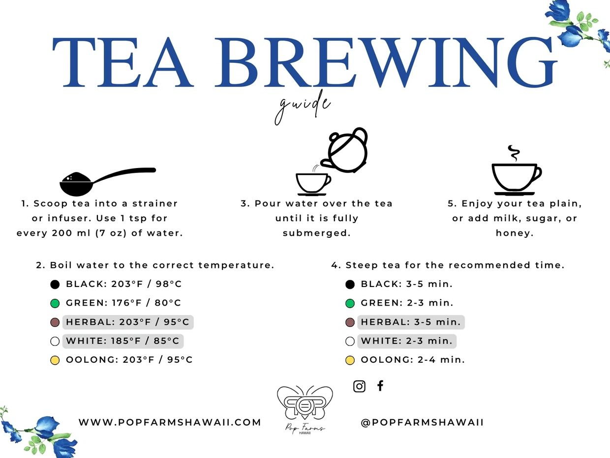 For optimal taste and benefits, steep 0.1 oz or 2.5 tablespoons of tea for 5-8 minutes for original butterfly pea and chamomile blends. White Peach infusion can be brewed for longer than 10 minutes to strengthen the fruity aromas.
